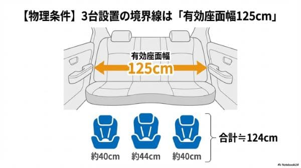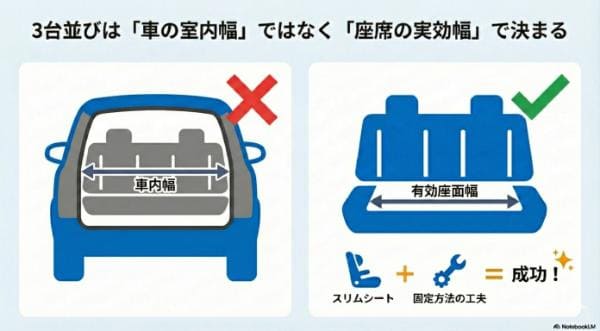 それは、チャイルドシートを3つ並べるには、車の室内幅ではなく、シートの幅と固定方法が重要ということです。