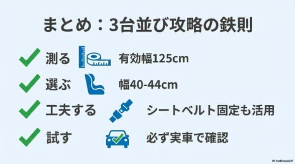 チャイルドシートを3つ並べることは、確かにパズルのような難題です。しかし、正しい知識とアイテムがあれば、必ずしも大型車への買い替えだけが正解ではありません。