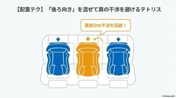 これを解決するのが、チャイルドシートの向きを交互にする「テトリス型」配置です。