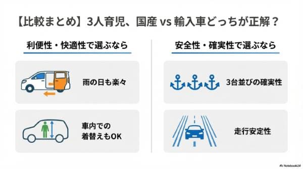 - 【比較まとめ】国産vs輸入車、3人育児にはどっちが正解?